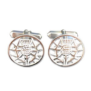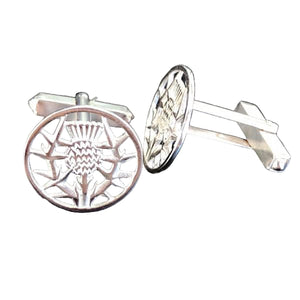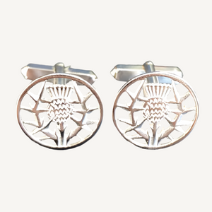 • These distinguished silver cufflinks showcase masterful craftsmanship, featuring the iconic thistle—Scotland's national emblem—rendered in gleaming sterling silver. Hand-crafted by Shetland Jewellery, each pair demonstrates the meticulous attention to detail characteristic of traditional Scottish silversmithing. The thistle design carries symbolic significance, representing resilience and pride, making these cufflinks a meaningful choice for those with Scottish heritage or appreciation for Celtic artistry. Perfect for formal occasions, professional settings, or as a treasured gift, these pieces combine aesthetic refinement with cultural resonance. The quality sterling silver construction ensures durability and timeless appeal, while the distinctive thistle motif sets them apart from conventional cufflink designs. An excellent investment in wearable art that honours Scotland's rich heritage.