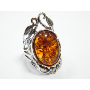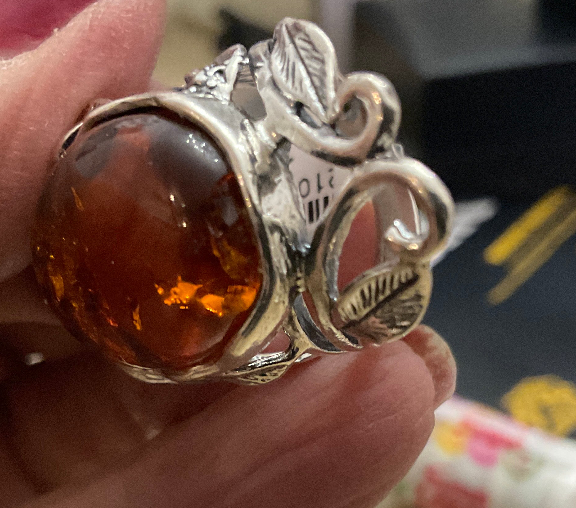 A stylish silver ring, handcrafted in Israel by Shablool. This gorgeous ring has a unique design with a large, beautiful amber stone in the centre. Small chip at top of amber.