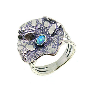 This beautiful flower ring is by the designer Tamir Zuman and handcrafted using sterling silver. The flower features a beautiful opaline stone in the middle which makes the piece unique.