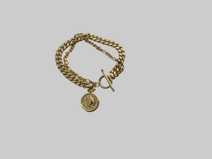 Timeless 18 carat gold plated coin bracelet made from stainless steel with quality gold plating 3 microns thick is hard wearing, tarnish free,waterproof. Versatile durable and todays up to date styling make this a jewellery piece to grab attention this season.