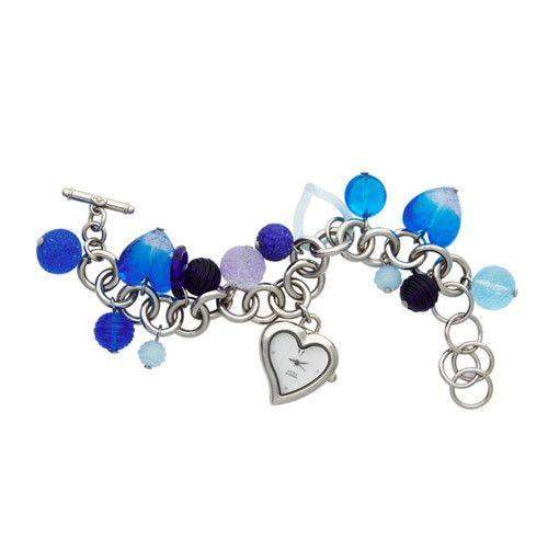 A superb stainless steel watch with exquisite Murano glass hearts and beads hanging like charms, from Antica Murrina. The murano glass beads are hand blown so every bead is unique.