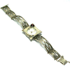 Beautiful hammered sterling silver watch with open wavy bands, scroll detail and a garnet gemstone. The watch also has a safety chain for extra security.