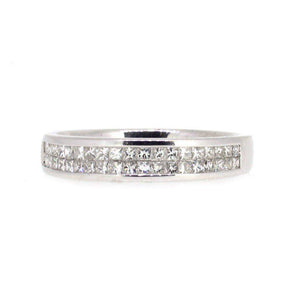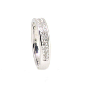 This 18 Carat White Gold half set diamond ring, is set with two rows of sparkly white princess cut diamonds for maximum effect 0.50ct altogether. It is 4mm wide.