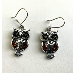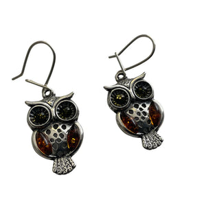 • These beautifully hand-finished designer owl drop earrings are crafted from high-quality sterling silver and feature stunning amber gemstones. The eyes of the owls are set with captivating green amber, adding a unique and enchanting touch to these exquisite earrings.