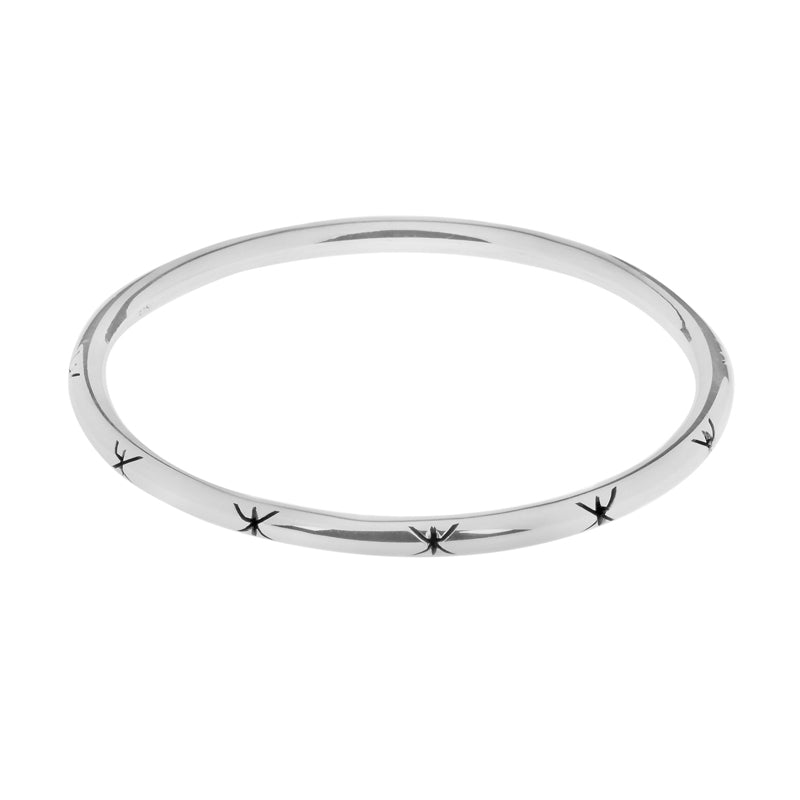 This exquisite sterling silver bangle by Tianguis Jackson beautifully reflects over a century of Mexico's rich silversmith tradition. Meticulously crafted, it features a distinctive six-pointed star pattern engraved into its surface, adding both visual appeal and cultural significance. The elegant yet contemporary design makes it a versatile accessory, perfect for adding a touch of timeless style to any outfit. Lightweight and comfortable to wear, this bangle is an enduring piece that combines craftsmanship with heritage, making it an ideal gift or a treasured addition to your own collection.