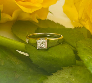 A stunning 18ct white gold princess cut certificated diamond engagement ring, This ring has an attractive modern raised design and is available set with a 0..34ct or 0.41ct princess cut diamond.