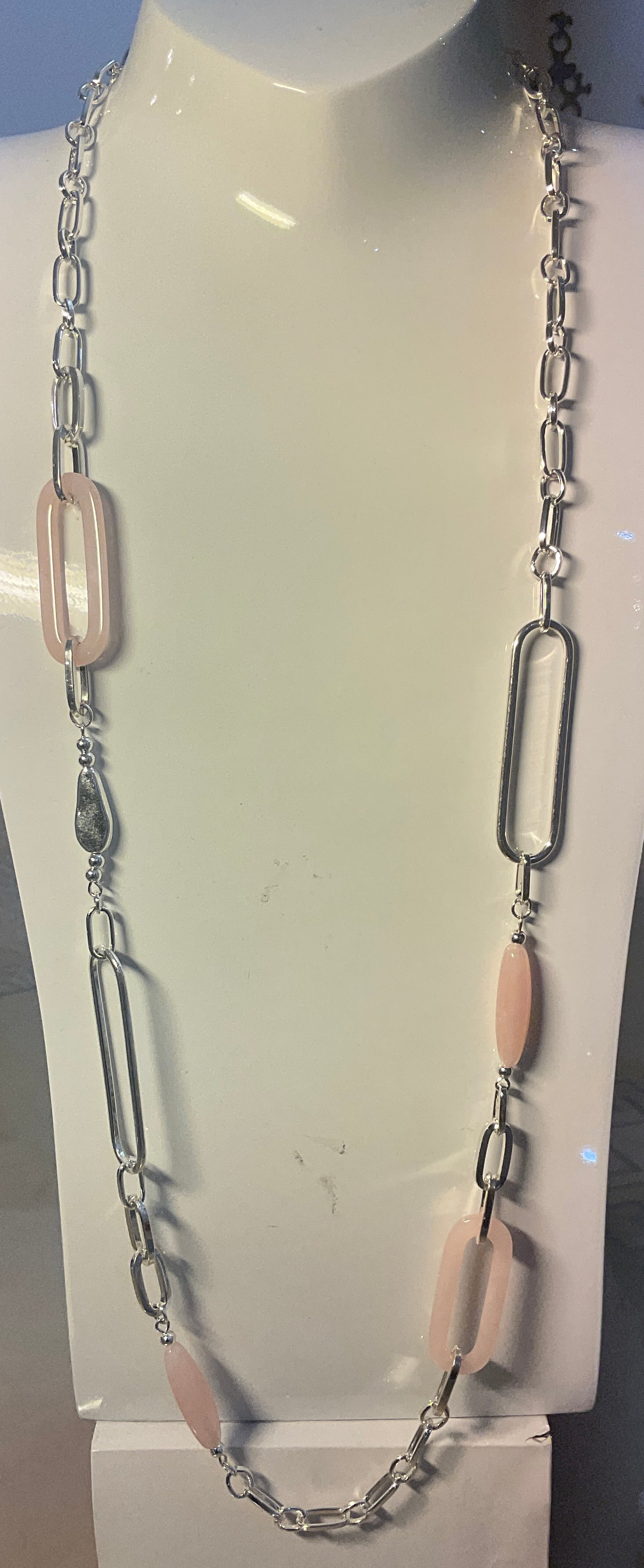 A stunning long silver coloured chain set with big resin shapes in soft pink..This shape of chain is very now! From our fashion jewellery section .Affordable and stunning on top of a dress or sweater.