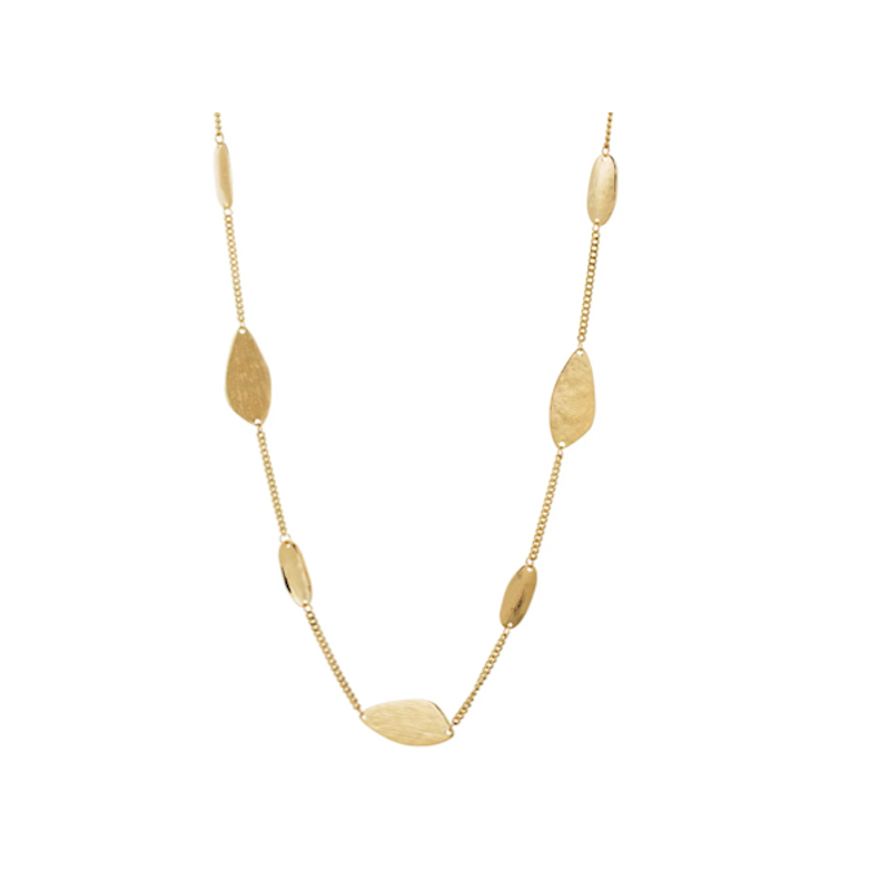 A stylish long gold coloured necklace from our fashion jewellery section. Affordable and stunning on top of a dress or sweater. Though the photos on the models don’t resemble the necklace totally the photos of it lying flat are exact.