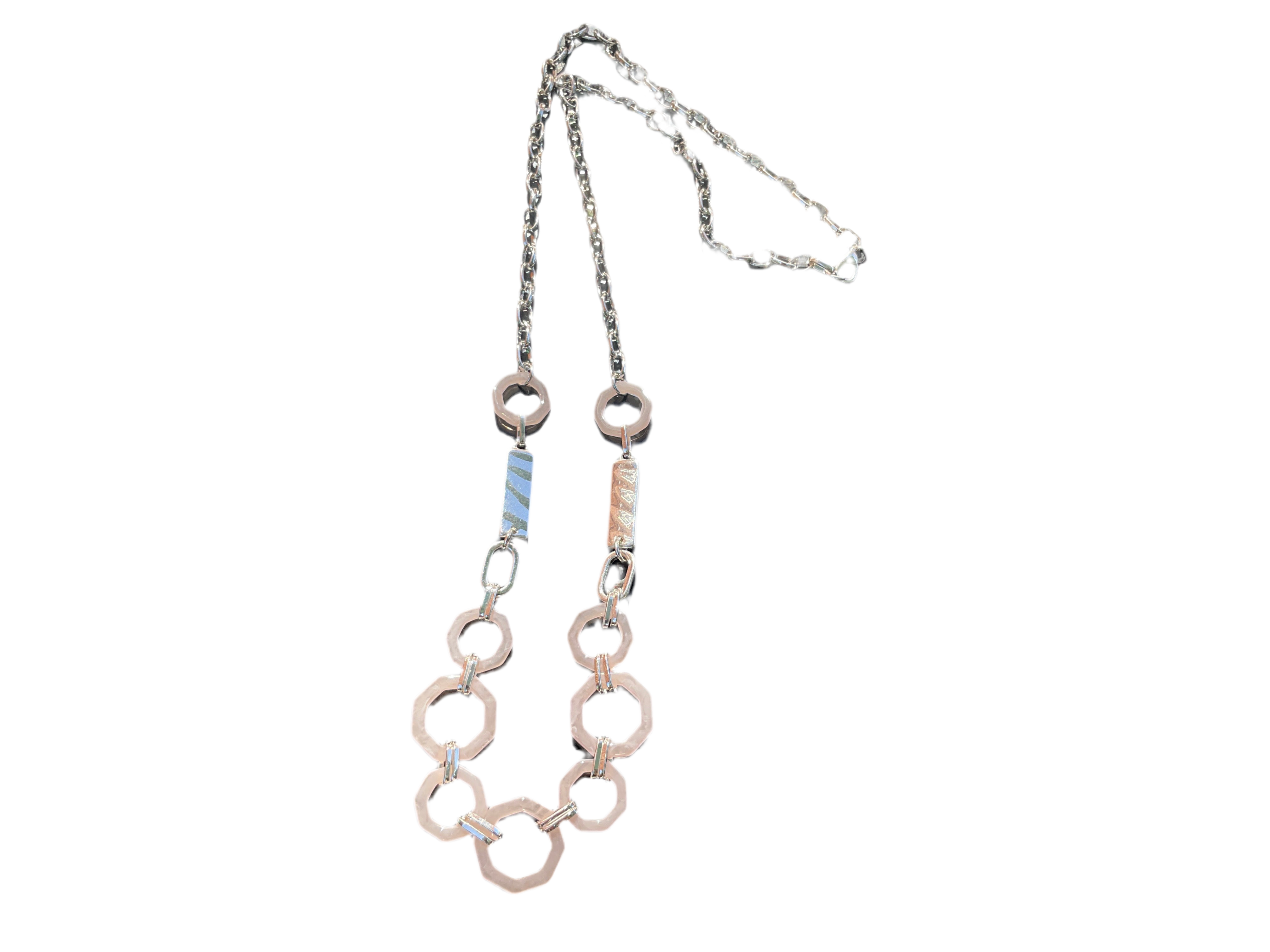 A stunning long silver coloured chain necklace with pink resin hexagonal and silver chain from our fashion jewellery section .Affordable and stunning on top of a dress or sweater.