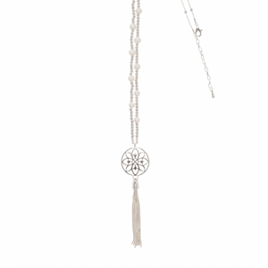 A beautiful long silver coloured necklace with faux pearls and silver beads from our fashion jewellery section. Set off with a double carved round pendant with a hanging tassel .Affordable and stunning on top of a dress or sweater.