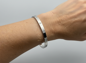 • A gorgeous bangle, which is unique to our fashion jewellery collection. The bangle has a twisted design made up of multiple silver coloured loops on a silver coloured bangle.