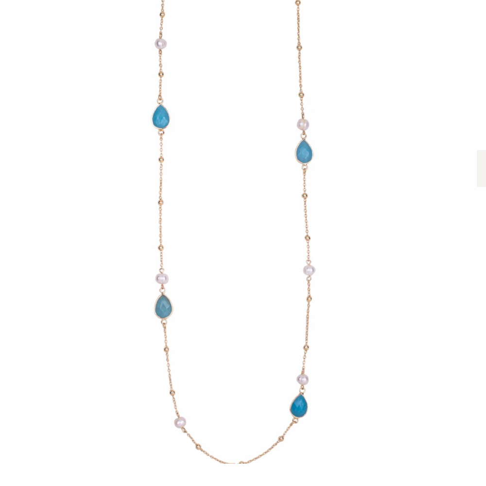 A lovely gold coloured necklace from our fashion jewellery collection. Small round gold coloured links make up the chain of the necklace, set with small beads freshwater pearls and chrysoprase stones.