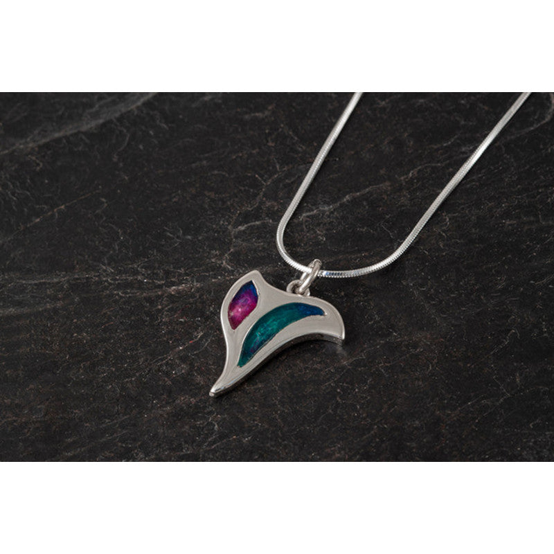 A captivating wave pendant that captures the ethereal beauty of the Northern Lights. Handcrafted by Shetland Jewellery, this piece combines traditional metalworking with artistic enamel detailing, featuring delicate brushwork that depicts the dancing aurora borealis across the pendant's surface. Available in your choice of sterling silver or 9ct yellow gold, the design showcases a graceful wave form that evokes the dynamic movement of the Shetland seas. The handpainted enamel work adds depth and character to each piece, ensuring subtle variations that make your pendant truly individual. The skilled craftsmanship reflects the jeweller's deep connection to the Shetland landscape, where both the Northern Lights and ocean waves hold cultural significance. This versatile pendant works beautifully on its own or layered with other pieces, making it an ideal choice for those who appreciate wearable art with meaningful storytelling and exceptional quality.