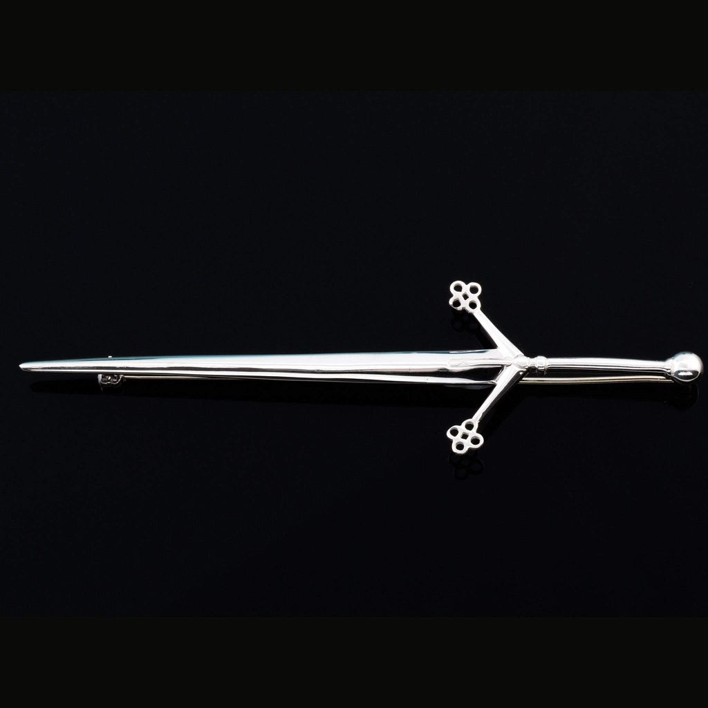 This distinctive kilt pin exemplifies authentic Scottish Highland craftsmanship, handcrafted by Shetland jewellers using either highly polished sterling silver or 9ct yellow gold. The design draws inspiration from traditional clan regalia, featuring an elegant claymore sword silhouette adorned with intricate Celtic knotwork along the handle. Each piece showcases meticulous attention to detail, with the polished finish catching light beautifully. The substantial weight and quality construction ensure durability for both ceremonial wear and everyday styling with traditional dress. Whether you're seeking an heirloom piece to honour Scottish heritage or a striking accessory for formal occasions, this kilt pin combines historical significance with contemporary jewellery-making expertise. Available in your choice of precious metal, it makes a meaningful addition to any collection of Celtic jewellery.