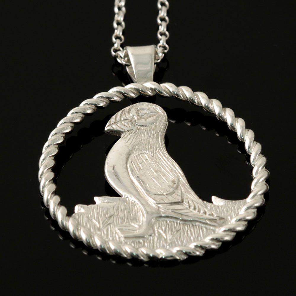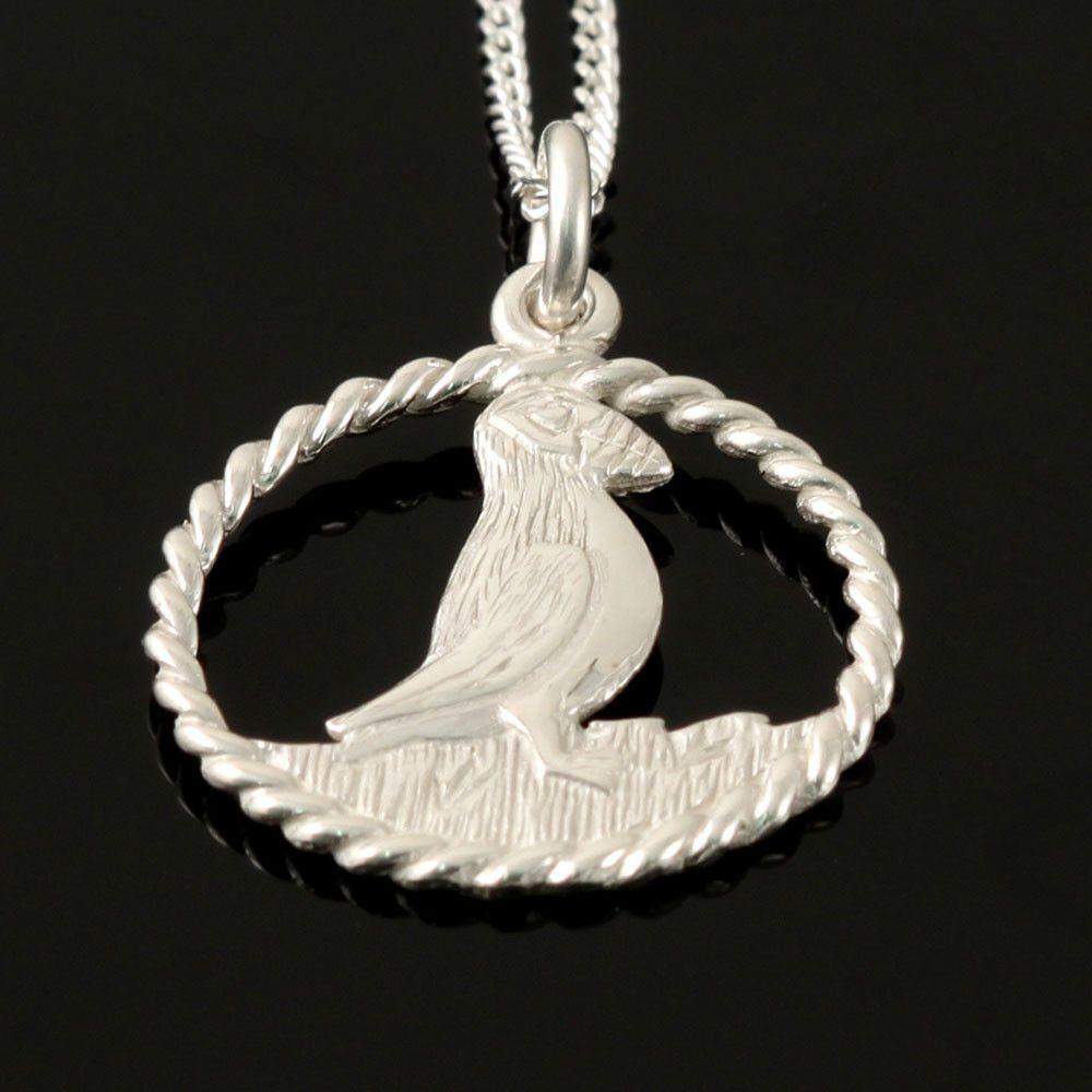 This exquisitely crafted pendant features a detailed puffin, meticulously designed by Shetland Jewellery to capture the distinctive character of the Atlantic puffin native to the Shetland Islands. Available in textured sterling silver or warm 9ct yellow gold, the puffin is elegantly framed by a twisted circular motif, symbolizing unity and the natural environment. The pendant’s intricate texture and refined craftsmanship highlight the unique features of this beloved seabird, making it a meaningful piece for nature enthusiasts and collectors alike. Its versatile design complements both casual and formal wear, offering a timeless tribute to Shetland's rich wildlife heritage.