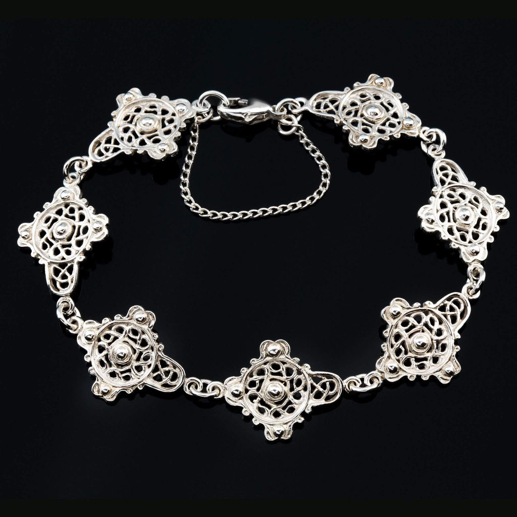 This exquisite bracelet draws inspiration from an authentic brooch discovered on St Ninians Isle in 1958, a significant find in Celtic archaeological history. Meticulously crafted by skilled Shetland artisans, it showcases the region's renowned jewellery-making heritage. Available in highly polished sterling silver or 9ct yellow gold, the piece features intricate Celtic knotwork that reflects the sophisticated design principles of ancient Celtic craftspeople. The knotwork pattern demonstrates the complexity and artistry characteristic of Shetland jewellery design, with each interlocking element carefully executed to create visual depth and movement. Whether you select the lustrous warmth of gold or the timeless elegance of silver, this bracelet serves as both a wearable work of art and a meaningful connection to Celtic cultural traditions. The polished finish enhances the dimensional quality of the knotwork, catching light beautifully throughout the day. An ideal choice for those who appreciate historical significance combined with contemporary craftsmanship.