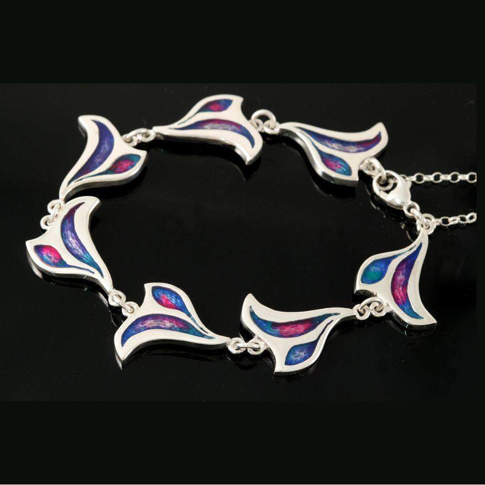 This exquisite bracelet celebrates the ethereal beauty of the Northern Lights, known locally in Shetland as the Mirrie Dancers. Handcrafted from highly polished sterling silver, this piece showcases the exceptional artistry of Shetland jewellery makers. The design is enhanced with meticulous enamel work that captures the luminous colours and dynamic movement of the aurora borealis. Each detail reflects a deep understanding of both traditional craftsmanship and the natural phenomena that inspire it. The combination of premium sterling silver and vibrant enamel creates a piece that is both visually striking and built to endure. Perfect for those who appreciate jewellery with cultural significance and artistic merit, this bracelet serves as a wearable connection to the dramatic skies of Scotland's northern isles.