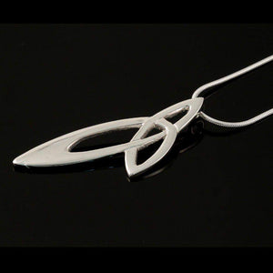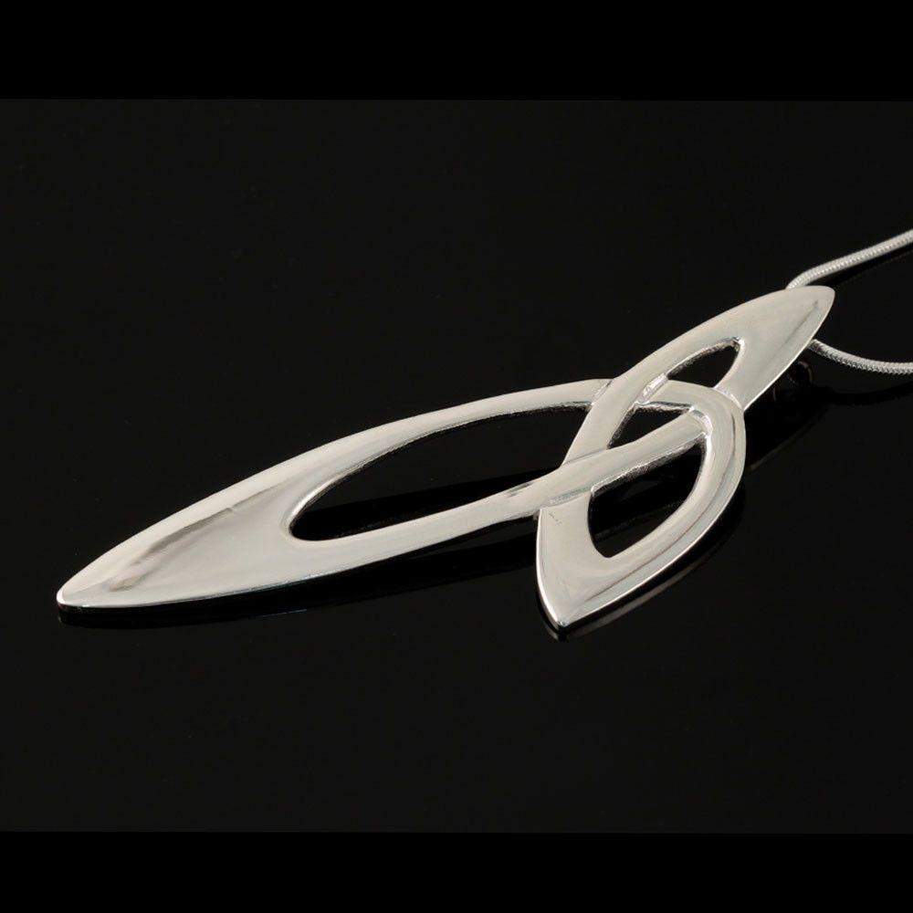 This pendant also know as the trinity knot is know as eternity after the continuous line on the piece also know as the line of life. The triquetra symbol has been found on stones that date back to 1000 AD and its also been found in the book of kells from 800 AD. The symbol represents three forces of nature earth, air and water and is made using highly polished sterling silver by Shetland jewellery.