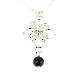 A sensational, sterling silver pendant with an intricate flower design. This lovely piece is available set with cultured freshwater pearl, onyx or opaline and is set on an 18" sterling silver chain. Matching earrings are also available.