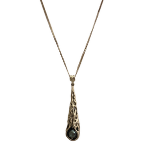 This gorgeous sterling silver pendant features a single fresh water pearl set in organic looking silver work, beautifully handcrafted by Hagit Gorali and a classic statement piece. Beautiful multi strand silver pendant flowing around a teardrop peacock fresh water pearl. Part of the Hagit Designs collection. Expertly designed to showcase the stunning beauty of the natural world, this pendant from Hagit Gorali's collection seamlessly blends organic elements with classic elegance. With a single, timeless freshwater pearl set in intricate sterling silver work, this pendant is the perfect statement piece for any occasion. Elevate your style and inspire awe with this sophisticated multi-strand design featuring a delicate teardrop pearl.